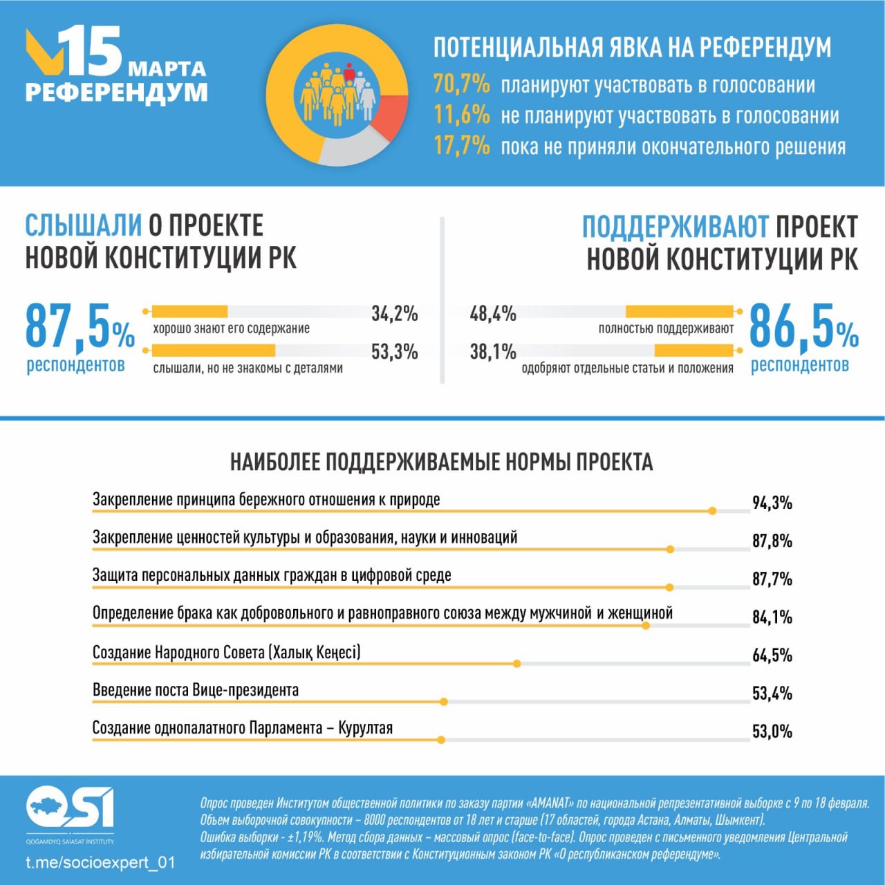 Опрос проведен Институтом общественной политики по заказу партии «AMANAT» по национальной репрезентативной выборке с 9 по 18 февраля. Объем выборочной совокупности – 8000 респондентов от 18 лет и старше (17 областей, города Астана, Алматы, Шымкент). Ошибка выборки — ±1,19%. Метод сбора данных – массовый опрос (face-to-face). Опрос проведен с письменного уведомления Центральной избирательной комиссии РК в соответствии с Конституционным законом РК «О республиканском референдуме».