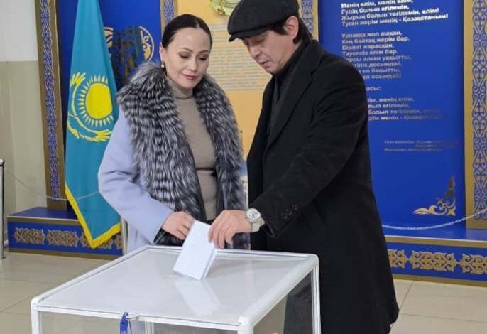 Актеры театра имени Т. Ахтанова семейная пара Шынтас Омаров и Айнагуль Улмесекова проголосовали на участке референдума № 12 в школе № 42 города Актобе.