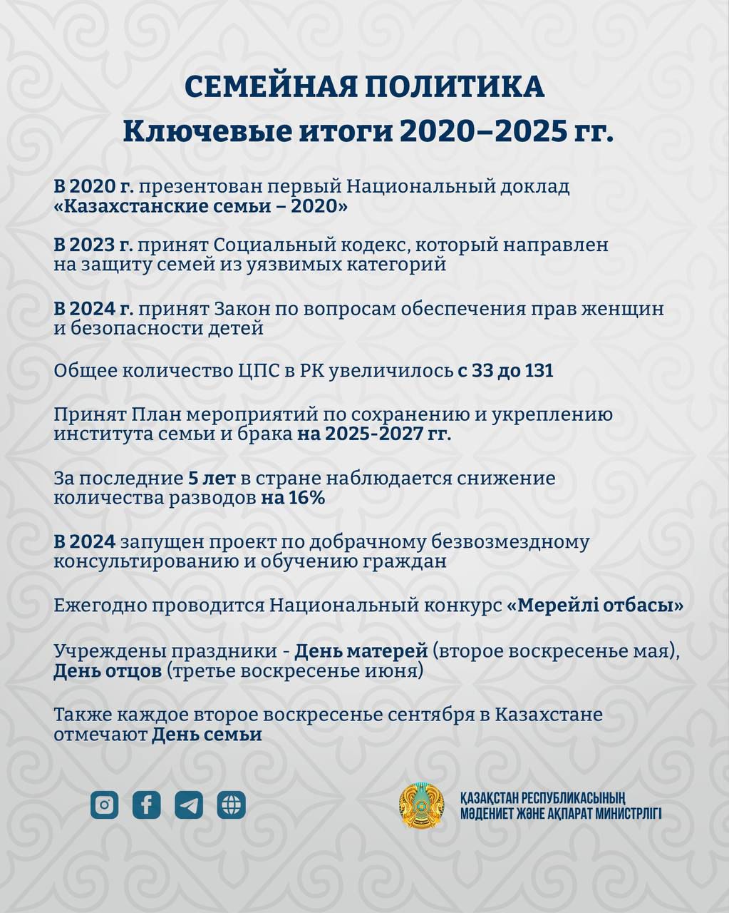 📌Укрепление нравственных и семейных ценностей в современном казахстанском обществе одно из приоритетных направлений деятельности Министерства культуры и информации.