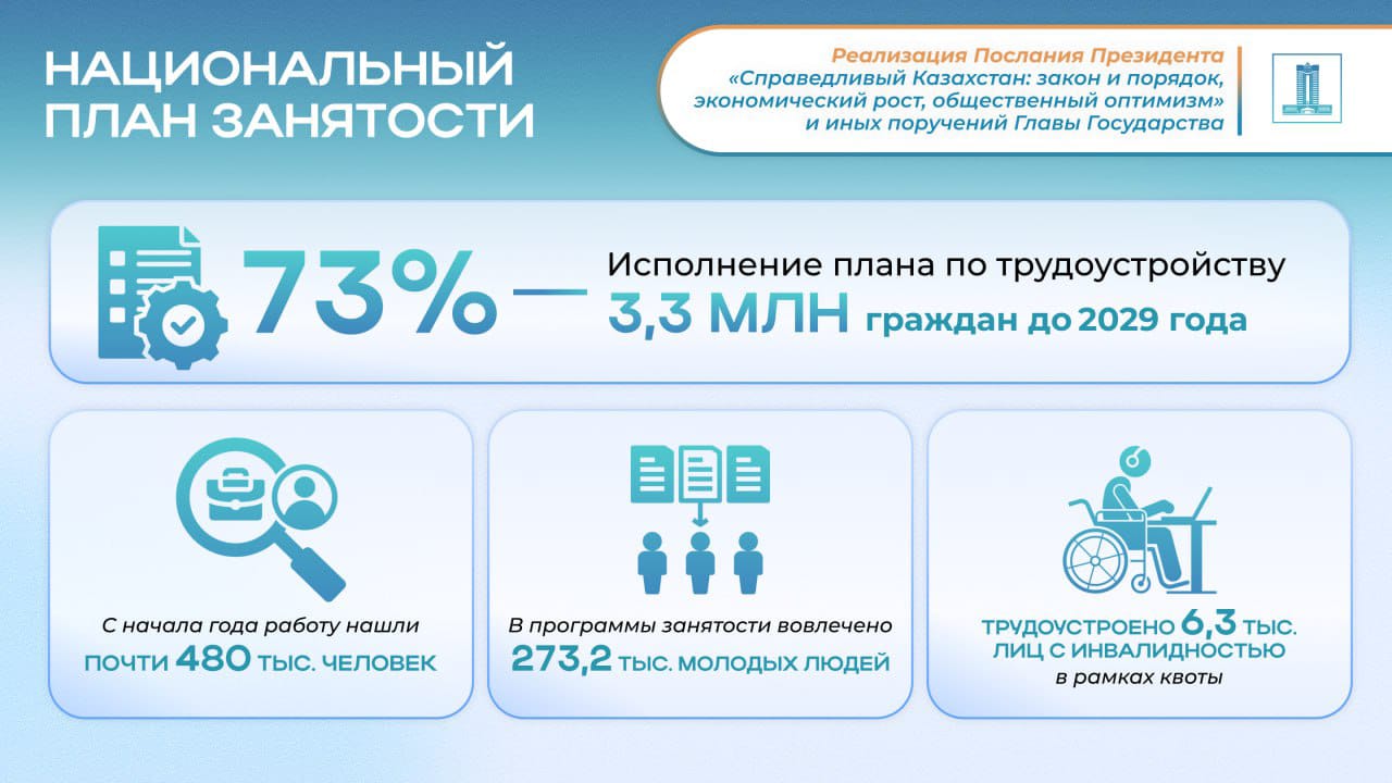 В рамках исполнения поручений Главы государства по обеспечению экономического роста Правительство реализует Национальный план по содействию занятости, который на сегодня исполнен на 73%.