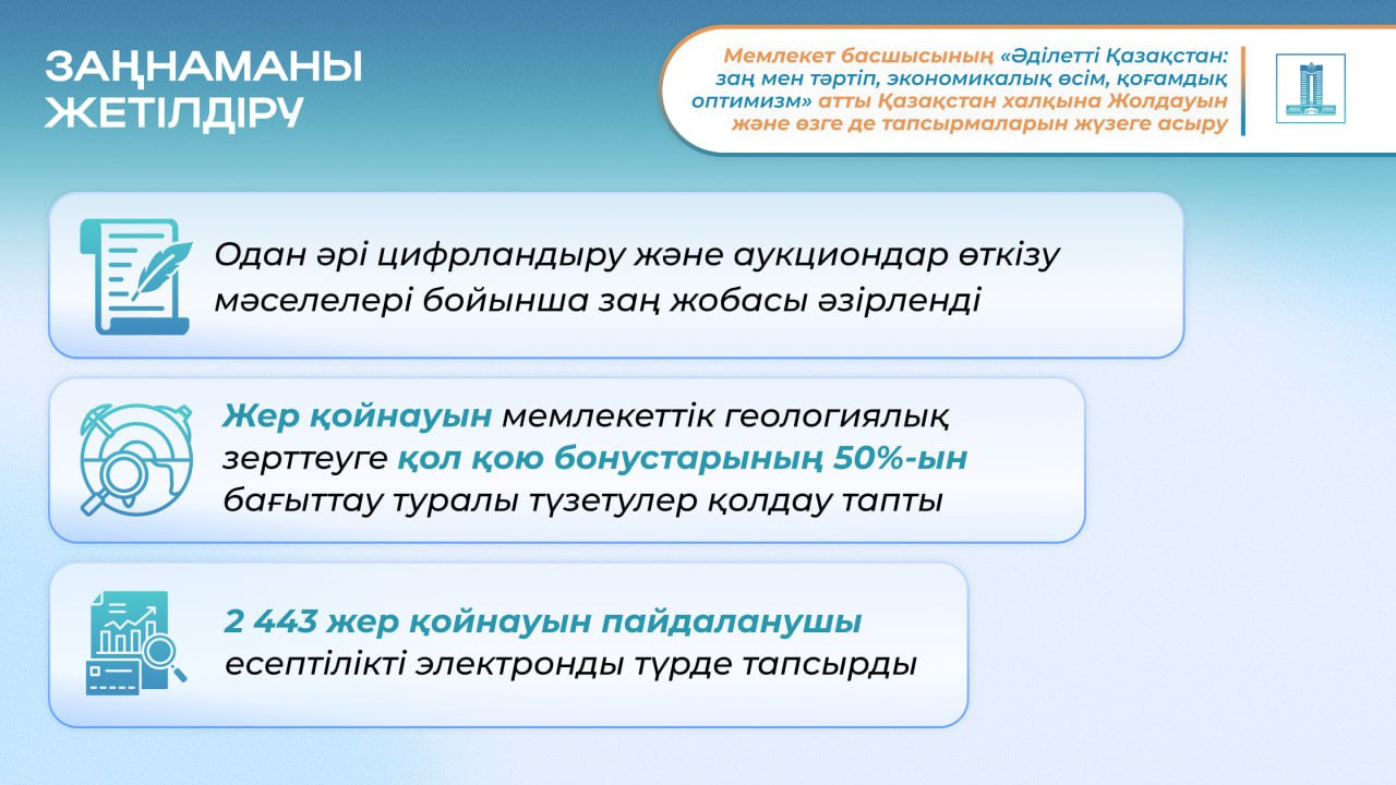 Саладағы тәртіпті қалпына келтіру рәсімдердің ашықтығын арттырумен қатар жүреді. 41 жер қойнауы учаскесі бойынша өткізілген 3 электронды аукцион бюджетке қол қою бонустары түрінде 27,8 млрд теңге әкелді. Заңнамаларды жетілдіру және процестерді цифрландыру бойынша жұмыс жалғасуда